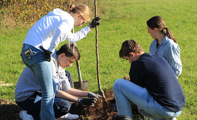 Zwei Kinder sitzen lächelnd mit einem Glas Wasser auf einer grünen Wiese. Im Hintergrund ist ein Baum mit Äpfeln
