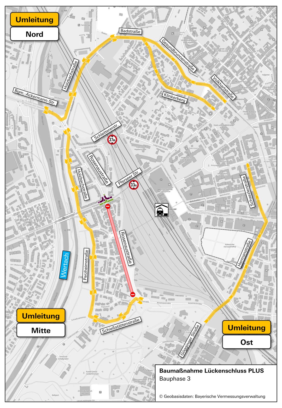 Am 4. Mai 2026 beginnen die Arbeiten für die neue Gleistrasse in der Rosenaustraße zwischen Sebastian-Buchegger-Platz und Kreuzung Pferseer Straße. In dieser Zeit ist die Rosenaustraße für den Autoverkehr komplett gesperrt. Die Stadt Augsburg nutzt diese notwendige Sperrung für die Erneuerung des Straßenbelags in der südlichen (Schießstättenstraße bis Sebastian-Buchegger-Platz) und nördlichen (Kreuzung Pferseer Straße bis Kreuzung Holzbachstraße) Rosenaustraße. Diese Abschnitte sind bis Herbst gesperrt.