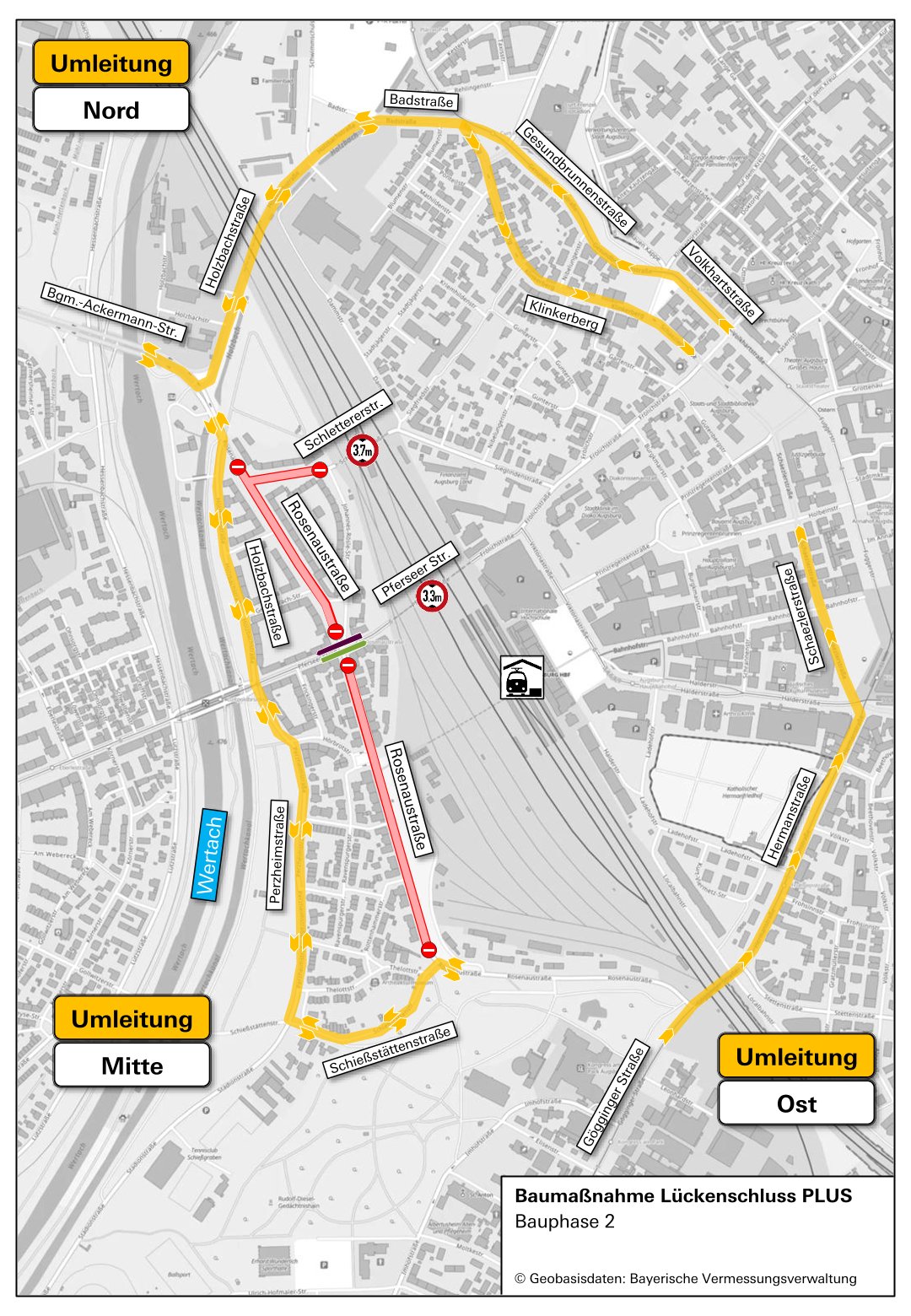- Tipp: weiträumige Umfahrung der Baustelle über Holzbachstraße/Klinkerberg und Hermanstraße/Schaezlerstraße