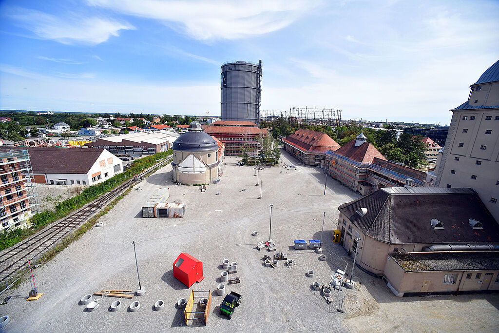 Momentan herrscht Baustellenstimmung auf dem Gaswerksareal. Die Fläche neben dem kleinen Scheibengasbehälter ist noch komplett leer. Als das Gaswerk noch in Betrieb war, waren hier die "westlichen Werkstätten" angesiedelt, in denen Labors zur Überprüfung der Stadtgasproduktion untergebracht waren. Jetzt entsteht hier Großes: Im Herbst beginnt der Neubau eines rund 2.000 Quadratmeter großen Gebäudes für Probenräume und Ateliers. Und auch das Reinigergebäude wird saniert, um Platz für Start-Ups und Unternehmen der Kreativwirtschaft zu schaffen.