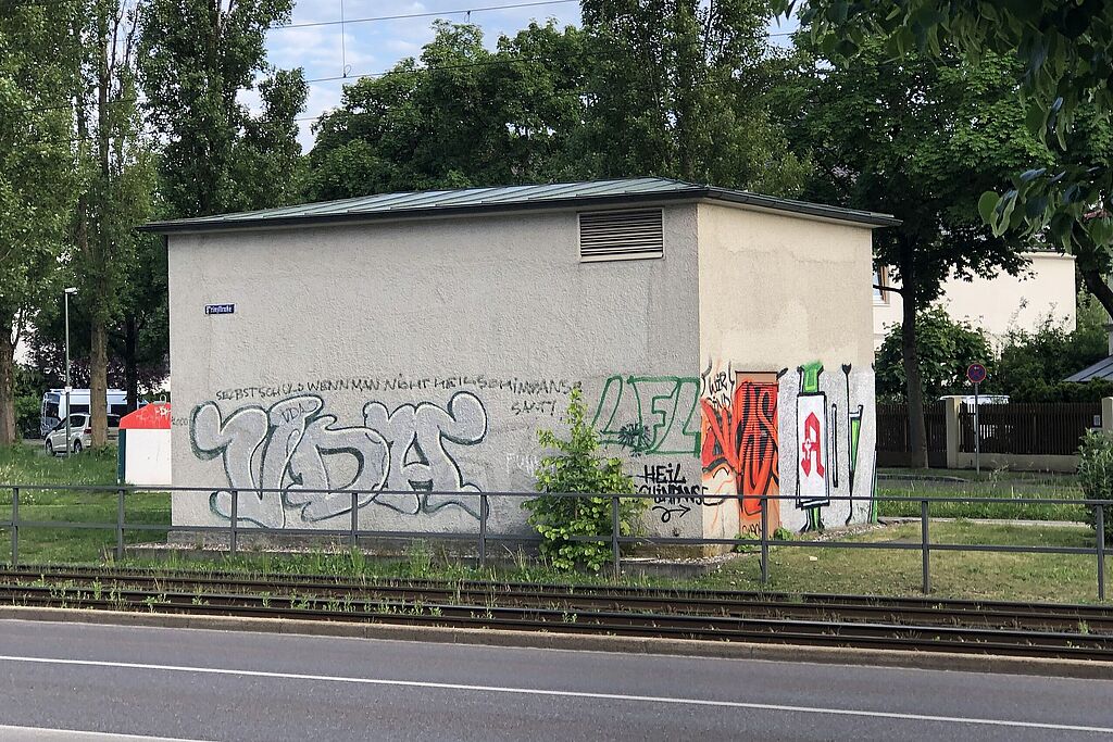 Noch ist die Trafo-Station der Stadtwerke Augsburg (swa) auf der Amberger Wiese im Textilviertel nicht gerade schön. Die weißen Wände sind durch einige Schmierereien verunstaltet. Bald ändert sich das aber: Denn die Station wird als 50. Station des swa Graffiti-Projekts mit den Bunten gestaltet. Ideen für die Gestaltung werden aus der swa Facebook-Community gesammelt.