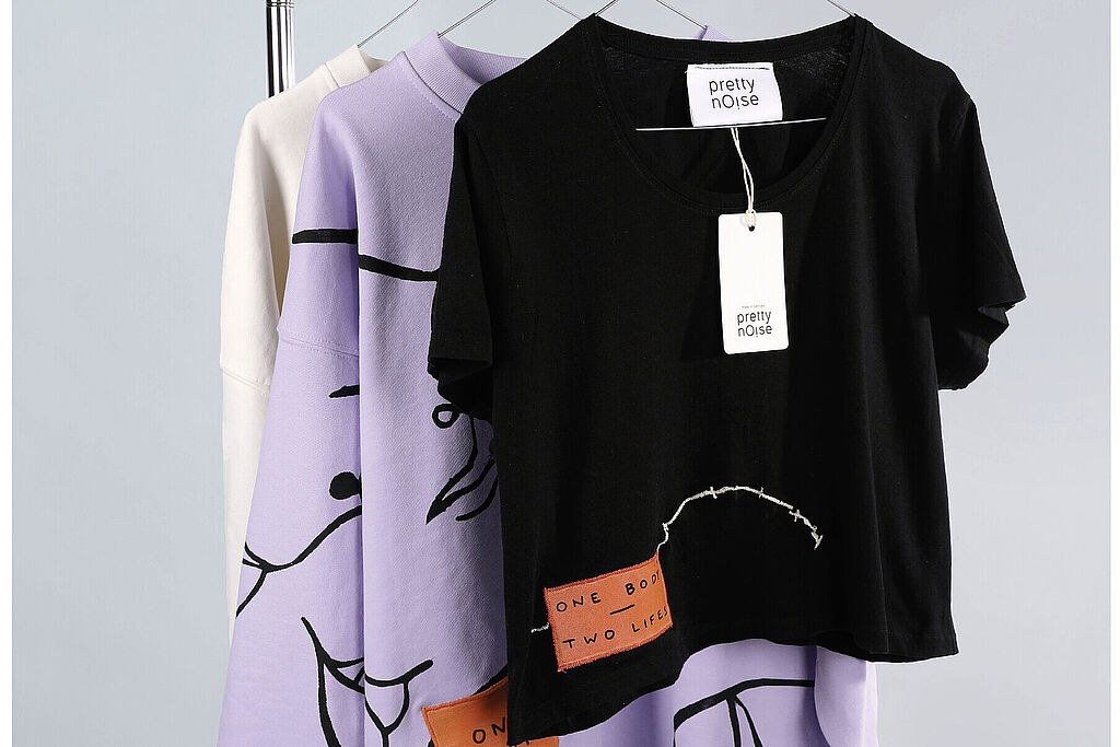 Für die rollende Ausstellung gestalten die Studierenden Plakate rund um ihre jeweiligen Abschlussarbeiten. Ob Fotografie, Video oder eigene Apps, die Themen der Arbeiten sind breit gefächert. Gemeinsam haben sie jedoch den Gedanken, nachhaltig Probleme lösen zu können und zum Nachdenken anzuregen. „Ich habe ein nachhaltiges Modelabel gegründet, das gleichzeitig politische Botschaften vermittelt“, beschreibt Studentin Lisa Klimesch ihr Abschlussprojekt. Auf den T-Shirts macht ein Aufdruck auf die Notwendigkeit von Organspenden aufmerksam.