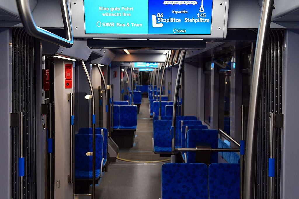 Die Innenraumgestaltung trägt die Handschrift der swa: viel Licht, das swa-Blau sowie dezente Pattern-Elemente. Moderne LED‑Lichtführung sorgt tageszeitgesteuert für eine angenehme Atmosphäre - morgens und abends eher warmes Weißlicht, tagsüber eher kühleres Licht. „Die Fahrgäste können sich auf einen optimal gestalteten Innenraum freuen“, berichtet Röder. „Vor allem durch die Anordnung der Haltestangen und Fahrscheinentwerter sowie der Haptik der Haltestangen ist die neue Straßenbahn sehr ergonomisch.“ Zudem verfügt sie über USB-Ladeanschlüsse, vergrößerte Türdurchgänge an erster und letzter Tür sowie eine energiesparende Fahrgast-Heiz-Klima-Anlage und Belüftung, mit einer Messung von CO2 sowie Temperatur innen und außen. Doch auch das Fahrpersonal profitiert: neue ergonomische Sitze, Kühlfächer, ein verbesserter Arbeitsplatz und klare Anzeigen für besonders energiesparendes Fahren, machen das Fahren jetzt noch angenehmer.