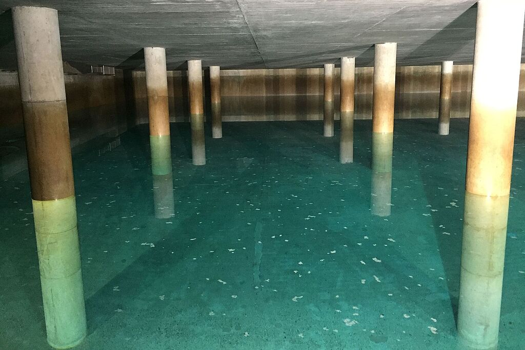 Auch wenn es so aussieht – das Wasser im Hochbehälter liegt nicht einfach nur still da, sondern ist in ständiger Bewegung. Tagsüber wird der Speicher entleert und sorgt gemeinsam mit den Brunnen im Südosten Augsburgs dafür, dass die Bewohnerinnen und Bewohner der Stadt auch in Spitzenzeiten ausreichend versorgt sind. Nachts, wenn im Versorgungsgebiet nur ein geringer Teil des Wassers der Brunnen verbraucht wird, werden die Kammern des Hochbehälters wieder gefüllt. Dabei darf der Wasserspiegel nie unter 3,5 Meter sinken, um eine „stille Reserve“ für den Notfall zu erhalten.