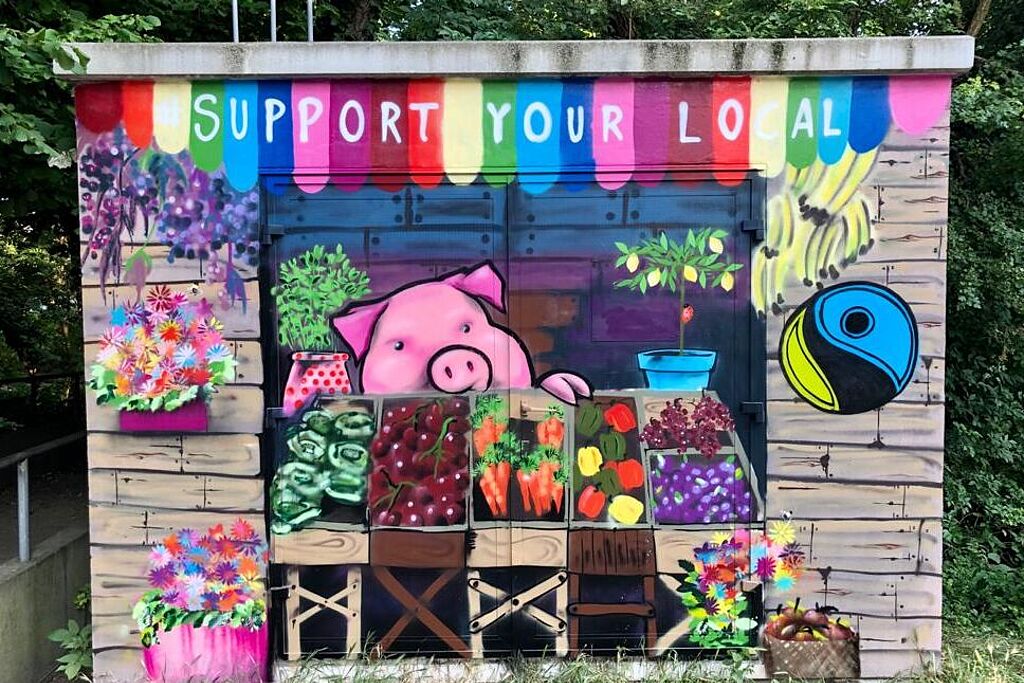 Doch was genau bedeutet Nachhaltigkeit eigentlich? „Nachhaltigkeit bedeutet für uns, regionale Produkte zu kaufen“, sagen die Studentinnen Lena und Anna. Plastikmüll vermeiden, auch an Morgen denken und Ressourcenschutz werden genannt. „Auch mal einen umständlicheren Weg wählen und diesen dann auch gehen“, sagt Studentin Lea. Gemeinsam werden Skizzen anhand der Beschreibungen erstellt und schließlich auch von den Studierenden auf das Technikhäuschen am Kappeneck gesprüht: Ein bunter Marktstand, bestückt mit regionalen Produkten, leuchtet von der Wand des Häuschens. Die Botschaft der swa „Gemeinsam nachhaltig“ ziert eine Wand. Sie sagt aus, dass Nachhaltigkeit nur dann funktioniert, wenn alle mitanpacken. Auf die Markise des Marktstandes ist der Schriftzug „Support Your Local“ geschrieben, daneben prangt das Fairtrade-Symbol.