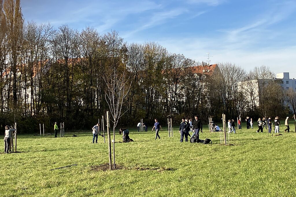 Die Sonne steht hoch über dem ehemaligen Dierig-Gelände in Haunstetten, als die ersten Spaten in die Erde stechen. Der Boden ist noch etwas feucht und die Luft riecht nach Herbst und frischem Gras. Zwischen den jungen Obstbäumen hört man Lachen und das Klirren von Werkzeug – 30 Auszubildende der Stadtwerke Augsburg (swa), auch swa Talents genannt, sind mitten in ihrer Pflanzaktion. Gemeinsam mit dem Landschaftspflegeverband Augsburg (LPVA) pflanzen die swa Talents heute insgesamt 15 Apfel-, Zwetschgen- und Birnbäume sowie einen Walnussbaum, die bald Teil einer großen Streuobstwiese sein werden.