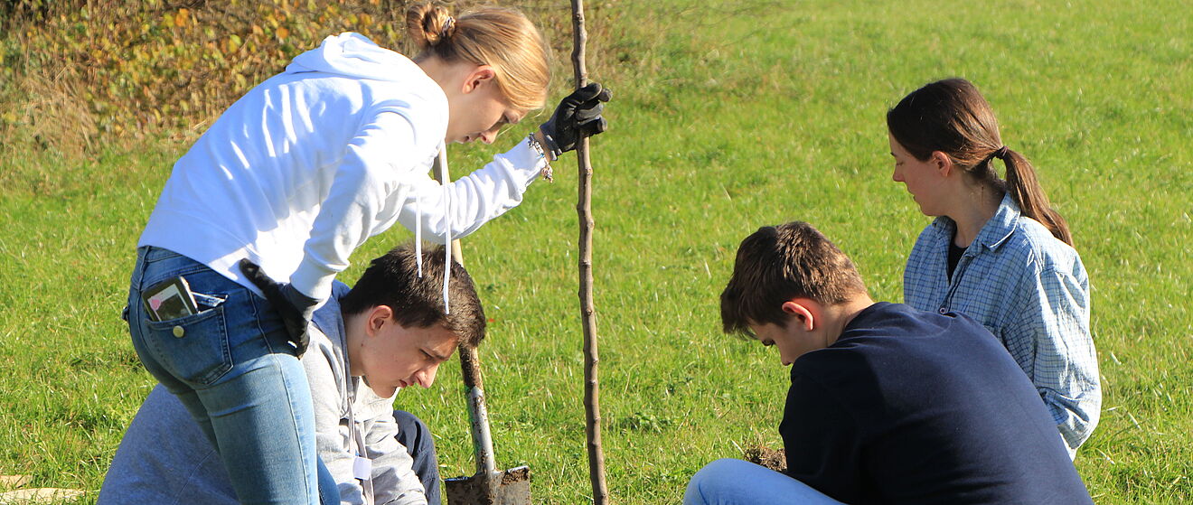 „Einen eigenen Baum pflanzt man nicht jeden Tag, daher finde ich es wirklich ein schönes Projekt“, berichtet Sandra Draxler, Auszubildene zur Industriekauffrau, während sie mit einem Spaten das Loch für den Baum aushebt. Bis der Baum erste Früchte trägt, wird es noch etwa zehn Jahre dauern, doch darauf freut sich Sandra jetzt schon. Zusammen mit einer Kollegin probiert sie, ob der Baum in das Loch passt und wickelt anschließend ein Netz um die Wurzeln, als Schutz vor Wühlmäusen.