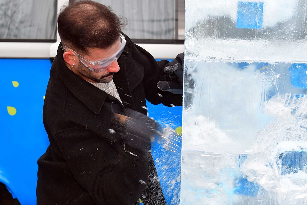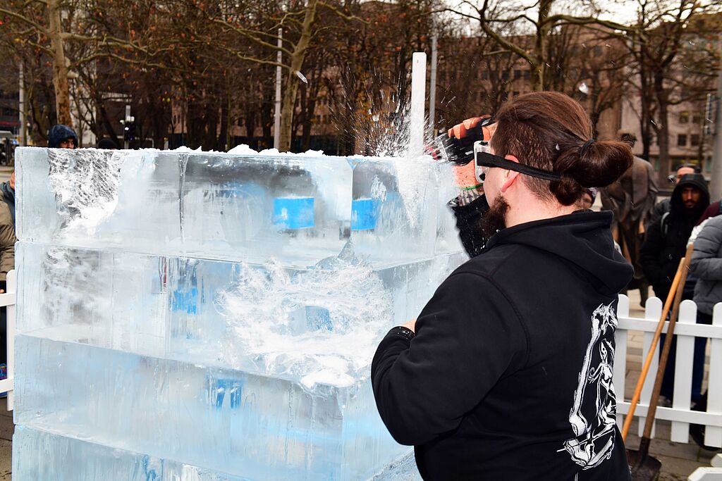 Es ist ein frostiger Freitagnachmittag am Königsplatz. Vor dem Manzú-Brunnen glitzert ein gewaltiger Eisblock, genauer gesagt ein Koloss – 1.500 Kilogramm gefrorenes Wasser und geheimnisvoll. Drumherum drängen sich Schaulustige, ausgestattet mit ihren Smartphones. „Das sieht ja aus wie ein Kunstwerk!“, staunt eine Passantin, während die ersten Herausforderer ihre Handschuhe überstreifen. Der Buzzer ertönt, und schon prallen Eispickel auf den Block. 60 Sekunden – mehr Zeit bleibt nicht, um dem Eis ein Geheimnis zu entreißen.