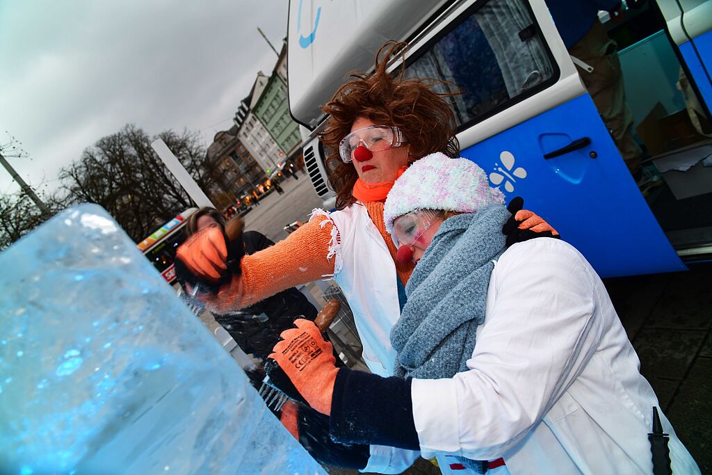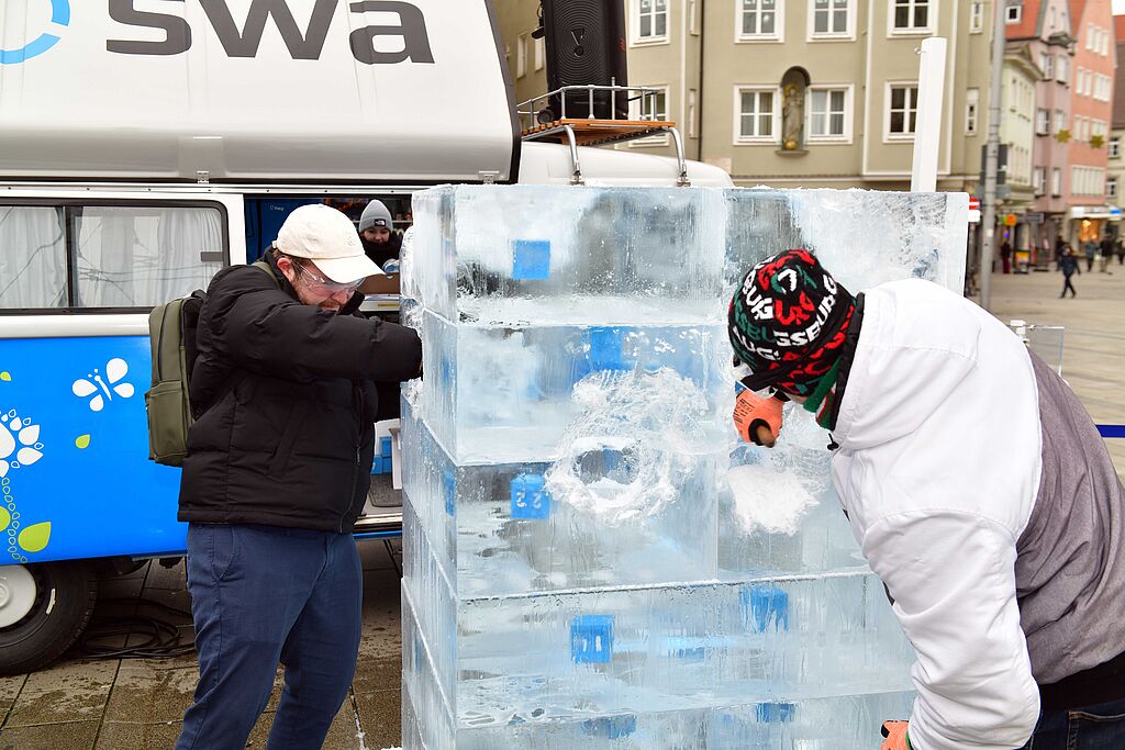 Die Challenge: Mit Kraft, Geschick und Taktik müssen die Teilnehmer möglichst tief ins Innere des Blocks vordringen. Dort warten 24 kleine blaue Holzwürfel – jeder ein Los für hochwertige Preise im Gesamtwert von über 2.000 Euro. Von einem Jahr kostenlosem Ökostrom über eine Fahrt mit der swa Partytram bis hin zu AEV- und FCA-Trikots oder Konzertkarten für das Kurhaus Göggingen – die Belohnungen sind heiß begehrt. Doch bevor der Gewinn winkt, heißt es: Hacken, schlagen, schaben – und hoffen, dass die Zeit reicht. Bereits zum zweiten Mal lockte die Eisblock-Challenge mutige Augsburgerinnen und Augsburger an. Und das Beste: Jeder Einsatz dient dem guten Zweck. Pro Teilnahme konnte freiwillig an die Elterninitiative krebskranker Kinder Augsburg – LICHTBLICKE e. V., genauer gesagt für die Einsätze der KlinikClowns, gespendet werden.