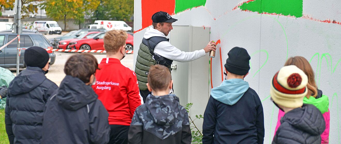 Jugendliche aus dem KidsClub des FC Augsburg und dem Junior Pantherclub verwandelten gemeinsam mit den swa ein Trafohäuschen in ein buntes Kunstwerk – ganz legal.