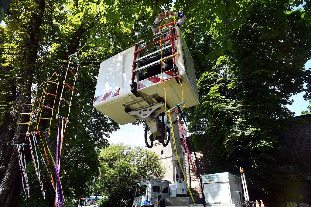 Noch mehr Farbe beim Urban Gardening Projekt der swa am Vogeltor: Die Schülerinnen der Mädchenrealschule St. Ursula haben einige Bäume mit sogenannten Himmelsleitern geschmückt.