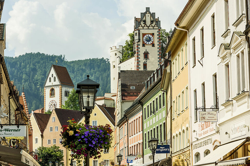 Knapp eine Stunde und zwanzig Minuten Fahrt vom swa-Carsharing-Standort Haunstetten Süd entfernt liegt die Stadt Füssen. Wie auch Landsberg liegt Füssen am Lech und grenzt im Süden direkt an Österreich an. Die Stadt ist nicht nur aufgrund ihrer Nähe zu den Bergen, den Königsschlössern und den zahlreichen Seen ein attraktives Ziel – auch sie selbst hat genug zu bieten, damit sich ein Abstecher lohnt: historische Bauwerke, mittelalterliche Gassen, die alte Stadtmauer und eine einladende Fußgängerzone mit bunten Häusern. Wer den Füssener Charme pur und unverfälscht in sich aufsaugen möchte, sollte auf einen Bummel durch die Reichenstraße flanieren. Sie ist das Herzstück der Stadt und steht mit ihren aufwendig bemalten Häuserfassaden sowie den vielen Cafés und Läden sinnbildlich für das Füssener Savoir-vivre.