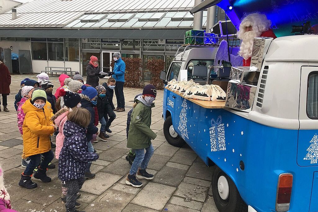 Der swa Weihnachtsbulli hat den swa Nikolaus passend zum Nikolaustag am 6. Dezember an die Partnerschulen der Stadtwerke Augsburg (swa) gebracht.