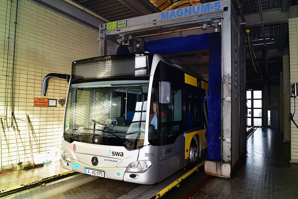 Rund 380 Liter Wasser werden gebraucht, um eine Straßenbahn komplett zu waschen. Dafür verwenden die swa Regenwasser, das in einer Zisterne unter der Anlage gesammelt wird. Es fließt direkt vom Dach der Werkstatt hinein und kann ungefiltert für die Straßenbahnwäsche verwendet werden, ganz ohne Zugabe von chemischen Reinigungsmitteln. In der Buswaschanlage, die sich im Busbetriebshof in der Lechhauser Straße befindet, wird Brauchwasser für die Wäsche genutzt. Es wird vor und nach der Wäsche gefiltert, sodass es mehrmals wiederverwendet werden kann. Durch diesen Kreislauf und die Nutzung von Regenwasser fährt die swa Flotte nicht nur klimaneutral, sondern auch nachhaltig sauber durch die Stadt.