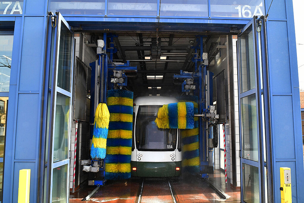 Wo sind die Straßenbahnen der swa eigentlich, wenn sie gerade nicht durch Augsburg rollen? Dann ruhen sie sich im Straßenbahnbetriebshof in der Baumgartnerstraße nahe dem Roten Tor aus. Ein echter Schönheitsschlaf, denn dort bekommen sie von den swa Straßenbahnprofis vor Ort die Rundum-Behandlung. Neben der Innenreinigung müssen die Straßenbahnen natürlich auch von außen glänzen. Dafür sorgt die Straßenbahnwaschanlage der swa. Sie befindet sich in einer Halle auf dem Gelände des Betriebshofs. Für die Reinigung fährt die Straßenbahn in die Halle ein. Per Knopfdruck wird ausgewählt, welches Modell gereinigt werden soll. Dann legen die XXL-Reinigungsbürsten der Waschanlage los und fahren jeden einzelnen Wagen von oben bis unten ab.