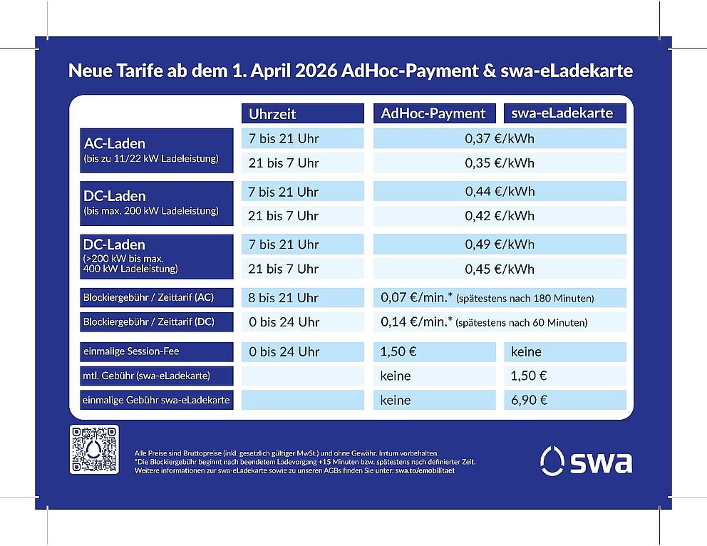 Ab dem 01.04.2026 bieten wir Ihnen neue Ladetarife für Adhoc-Payment und die swa-Ladekarte.