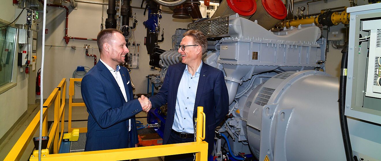 Tobias Schnell, Geschäftsführer von Rolls-Royce Solutions Augsburg GmbH und swa-Vertriebsleiter Ulrich Längle (v. l.) freuen sich, dass im Rahmen der Kooperation die industrielle Abwärme ab Mitte 2025 in das swa Fernwärme eingespeist werden kann.Foto: swa / Thomas Hosemann